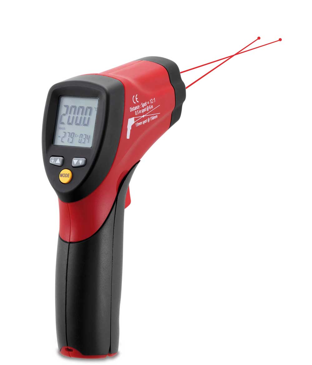 Infravörös hőmérsékletmérő műszer dupla lézerpontos tájolással. Kis méretéből adódóan akár zsebben is elfér.